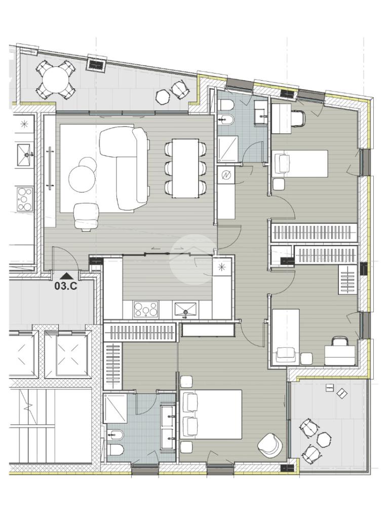 Nello specifico, l’appartamento proposto in vendita è un quattro locali di 137 mq situato al quarto piano. L’ingresso si apre su un’ampia zona living, dalla quale si accede a un terrazzino, con cucina separata. Un disimpegno conduce a un bagno finestrato con doccia. La zona notte è composta da due camere singole e da una camera matrimoniale dotata di cabina armadio, bagno en suite e accesso a un secondo terrazzino.