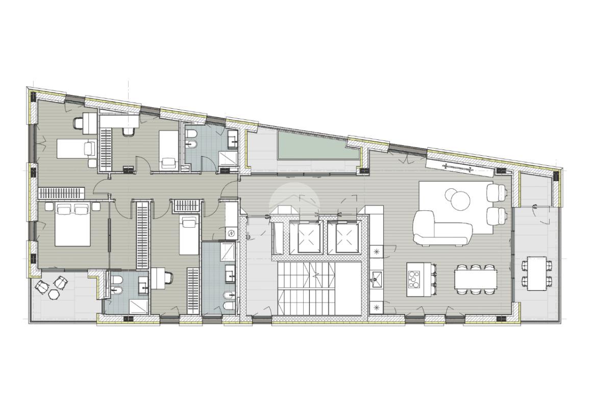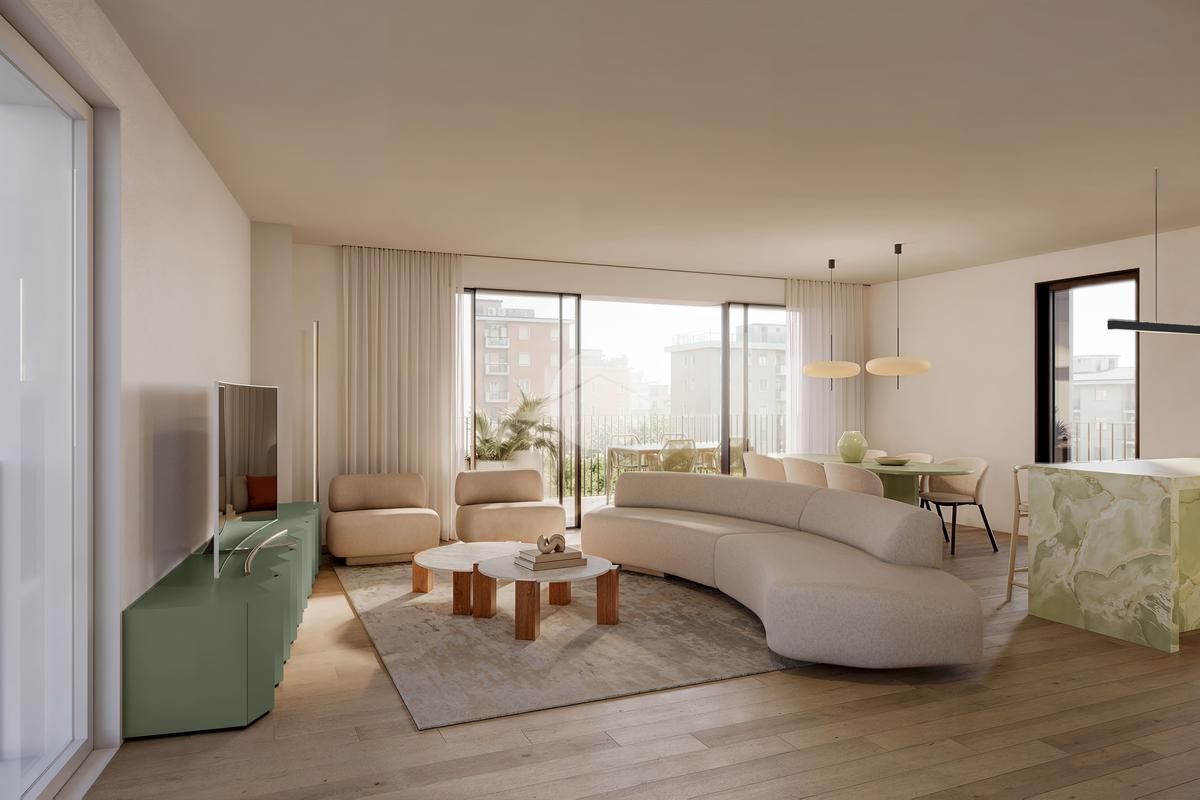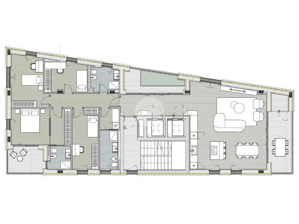Nello specifico, l’appartamento proposto in vendita è un attico di cinque locali di 207 mq, situato al settimo e ultimo piano e caratterizzato da una splendida vista panoramica. L’ingresso regala subito una suggestiva vista sul terrazzo privato e verandato e conduce a un’ampia zona living con grande cucina a vista, dalla quale si accede a un secondo terrazzo di generose dimensioni. Un comodo disimpegno accompagna alla spaziosa lavanderia e a un bagno finestrato con doccia. La zona notte è composta da tre camere singole, servite da un secondo bagno finestrato con doccia, e da una camera matrimoniale dotata di bagno privato e accesso a un ulteriore terrazzino.
